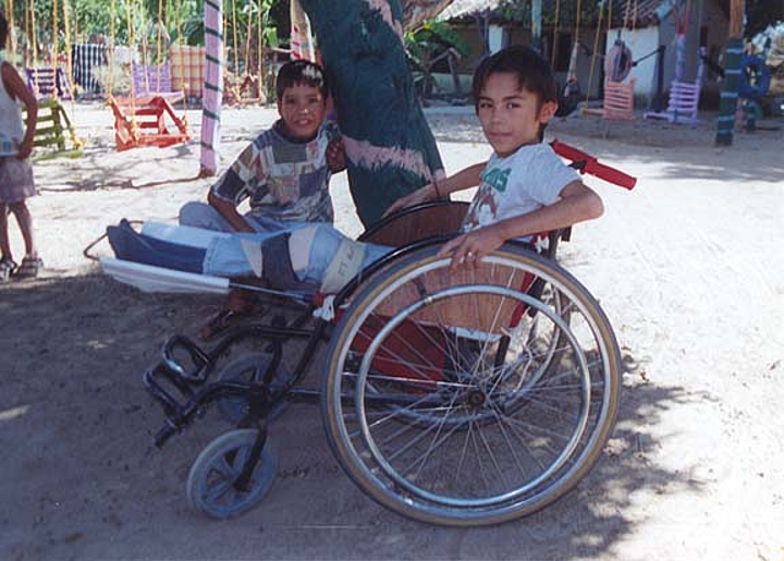 And once his knees were straighter, they put a long support made of cloth suspended between rebar projecting forward from his wheelchair seat. This helped keep his legs extended and gradually straightened them more. When at last he could stand upright, they helped him to walk between parallel bars. Then with crutches. And finally, all by himself. Village children invited him to play ping-pong and tether ball in order to improve his strength and coordination and have fun doing so. Carlos—and all of us—were excited by his progress.