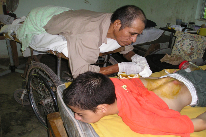 Although, with a reliable supply of clotting factor, Carlos’s hemophilia was now largely under control, he still needed to cope with damage already done. When we’d first met, he was severely disabled. Because every movement was painful to where he’d been unable to sit up by himself, his muscles had grown frail. His knees became contracted in a bent position, so that even when free of pain he couldn’t have stood upright, much less walk. So we embarked on a long endeavor of rehabilitation. This involved numerous visits to PROJIMO, our village rehab program, which was then in the village of Ajoya. Carlos usually came with his mother. They stayed in the home of an amiable family who also had a disabled youth, who gladly helped Carlos with his rehab.